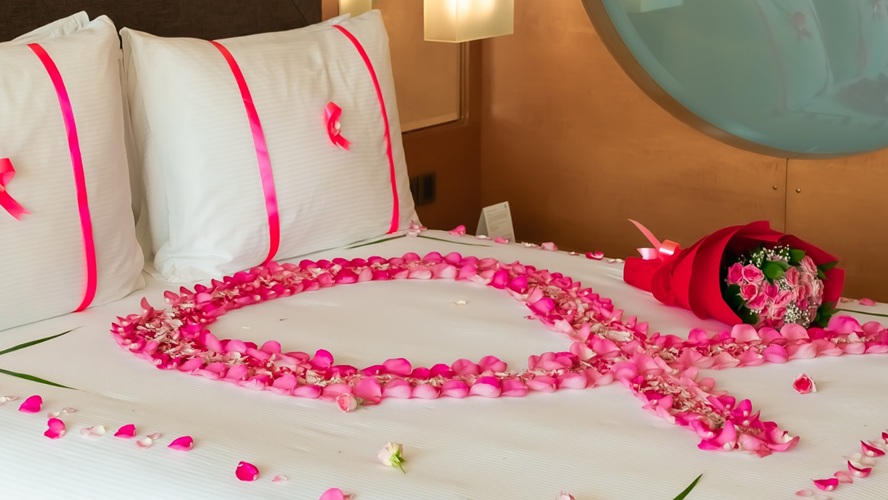 The Pink Room setup features elegant flower arrangements, a small bouquet, a signature pink ribbon design on the bed, pink ribbon accents on the pillows, balloons across the ceiling and floor, and delicate flower petals spread across the bed. The experience also includes a beautifully styled bathroom setup, featuring a bubble-filled tub decorated with a heart made of petals, romantic flower petals spread around the bath, and battery-operated candles.