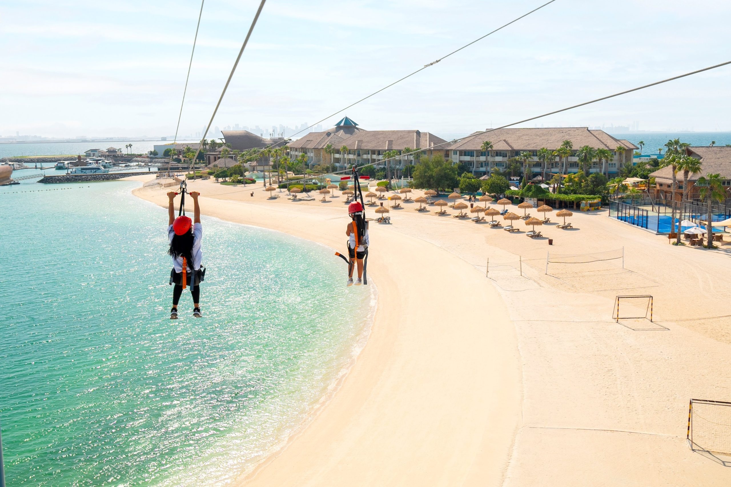 Corporate and social groups can choose from three Adventure packages for groups of 10 to 80 people. Each package includes entry to the park, return boat transfers, lunch, full pool and beach access, and zipline rides. Available from Saturday to Thursday, these packages deliver a ready‑made platform for team building, bonding and growth and are priced from QAR 375 per person.