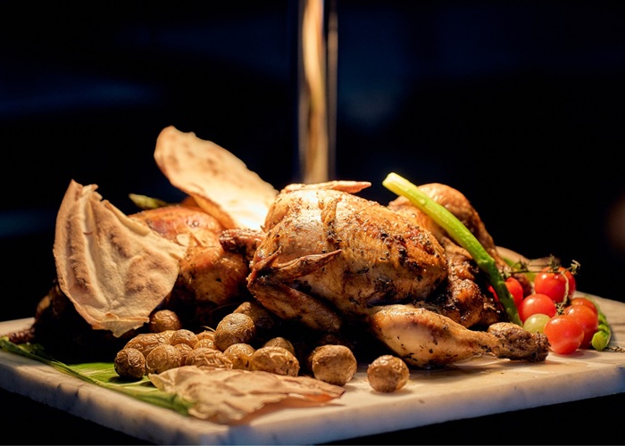 - Flame-grilled meats and skewers from live BBQ stations
