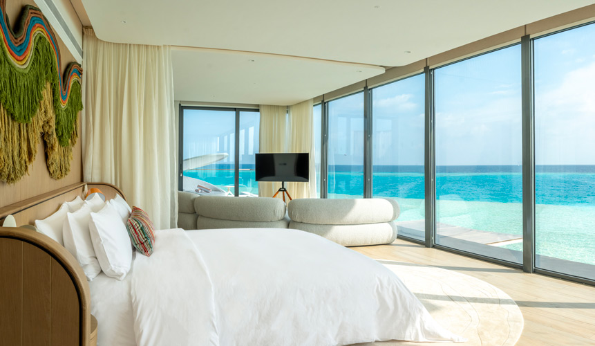 For Gulf families seeking a design-forward retreat, SO/ Maldives offers spacious residences that promise breezy island ease combined with sartorial elegance. The Two Bedroom Lagoon Beach Pool Loft opens directly onto white sand and crystal-clear lagoon waters. Spread over two levels, it features a separate living and dining area, sculptural details, and a statement cocoon tub with views across the reef. Families drawn to life above the sea may choose the Two Bedroom Ocean Water Pool Atelier with a wraparound terrace, private pool, and floor-to-ceiling glass framing the Maldivian horizon.